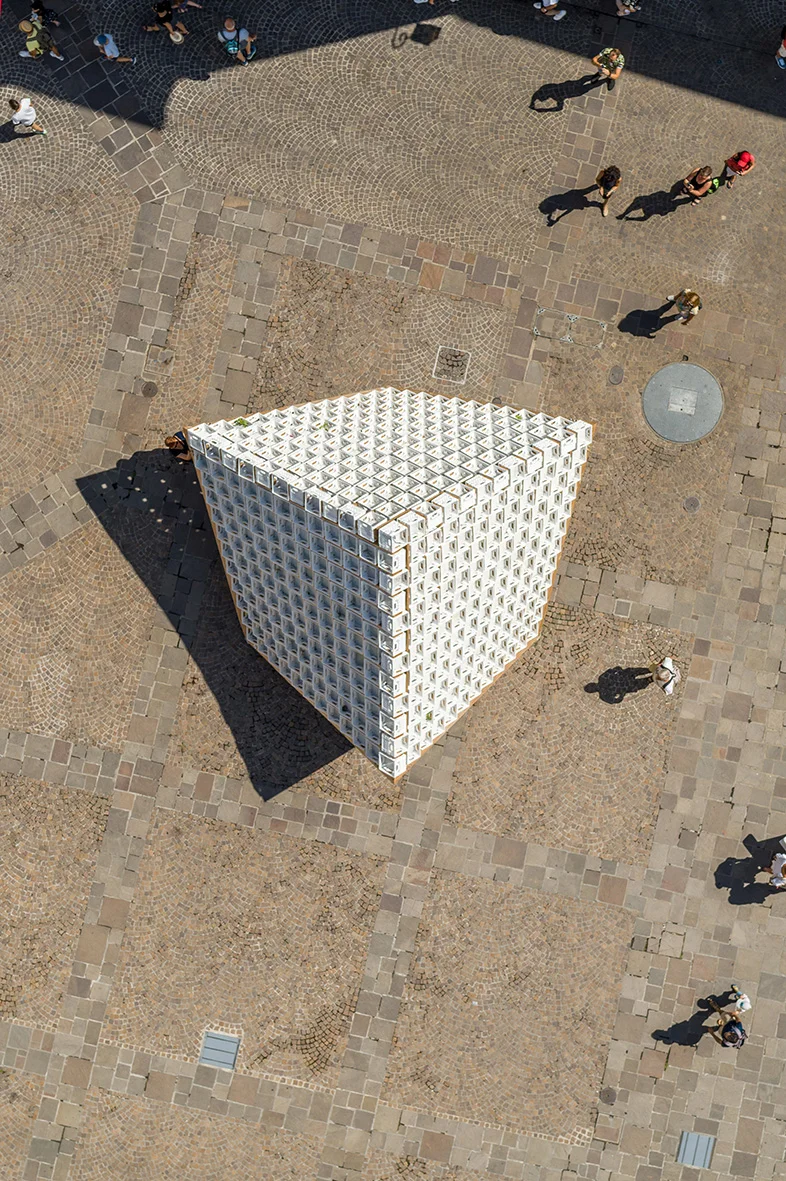 While the exterior shape of the pavilion recalls the hipped and gabled roof forms of the historic buildings of Annecy, the planted interior creates a suspended garden within the hardscape of the old city center. The geometric form of the pavilion - three sides of a cube tilted to contact the ground at three foundation points and warped slightly to elevate the structure - belies the organic nature of the experience within. The upside-down lawn at the interior engages visitors and invites them to reconsider notions of nature within the context of the man-made. Additionally, the garden of hanging shade-tolerant plants provides an environment maintained at a cooler temperature through a combination of shading and evapotranspiration.